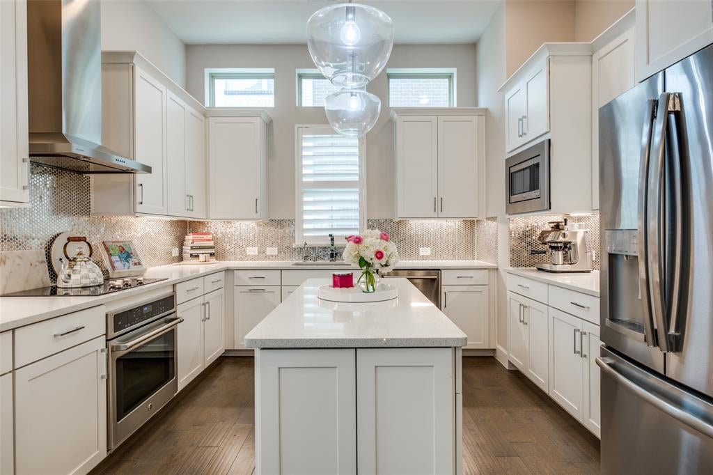 Seller is offering a 2% credit toward closing costs or an interest rate buy down! This multi-level townhome sits on a desirable corner lot and offers exceptional private outdoor space—including a fenced front yard, side yard, and a rooftop deck with panoramic views of downtown Dallas. Thoughtfully designed and well maintained, the home features wood floors throughout, 4-inch hidden tilt wood shutters and custom lighting. The kitchen is both functional and stylish, with quartz countertops, stainless steel appliances, and modern fixtures. An adjacent dining area, oversized living room with soaring ceilings, and a sleek powder bath make the second floor ideal for entertaining. The primary suite includes a spacious walk-in closet and a spa-like bathroom with dual vanities and a large shower. Two additional bedrooms each have private ensuite baths, offering comfort and privacy for family or guests. Conveniently located near Love Field, and Dallas’ top dining and entertainment districts!