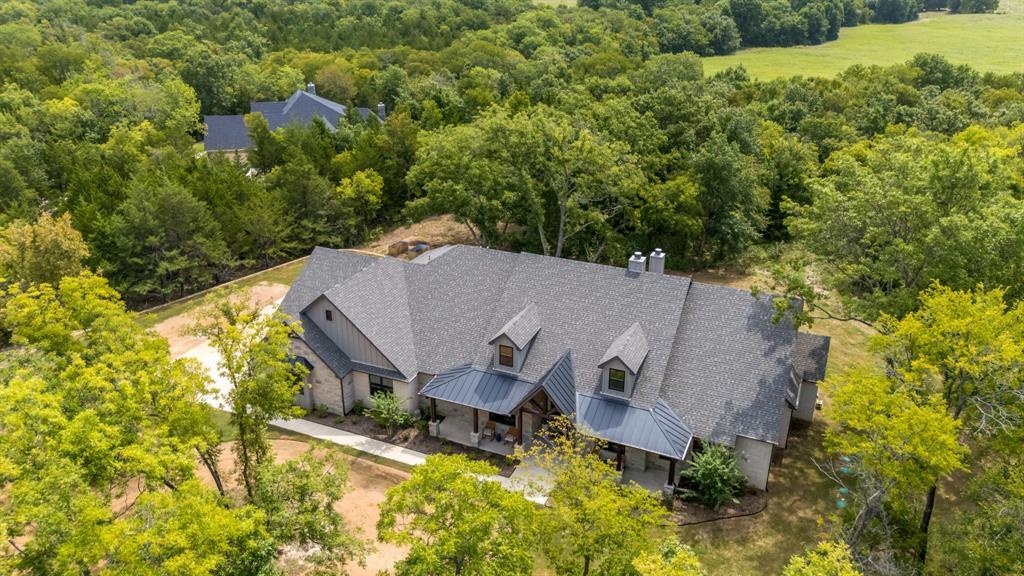 Gorgeous, one-of-a-kind single-story custom home nestled on nearly four private acres! Peace and serenity await as you arrive down your tree-lined driveway, flanked on both sides by mature trees, creating a storybook entrance that sets the tone for the privacy that surrounds you. While tucked away from the hustle and bustle, the property is still conveniently close to major highways, shopping, and dining, offering the best of both worlds—country living with modern conveniences. Bring your horses and livestock, as there is no HOA, you are outside city limits, and there are no city or MUD taxes. The charming front porch welcomes you in, while the functional open-concept floor plan is designed for both daily living and effortless entertaining. A hidden pantry disguised behind cabinetry doors, a large built-in refrigerator, and seamless flow to the screened outdoor living space make this home both stylish and practical. Additional highlights include a bonus room for a safe room equipped with a sauna, a Texas basement above the oversized four-car garage for extra storage, and an impressive smart home system with control of most lights, shades, and fans. A whole-home speaker system extends into the living room, kitchen, master suite, loggia, and dedicated media room with full surround sound. Security features include a monitored system and eight outdoor cameras for peace of mind. Whether you are enjoying movie nights in the media room, quiet evenings on the porch, or hosting gatherings with spaces that flow seamlessly from indoors to out, this home offers it all—a rare retreat that combines privacy, convenience, and thoughtful design, ready for its next chapter.